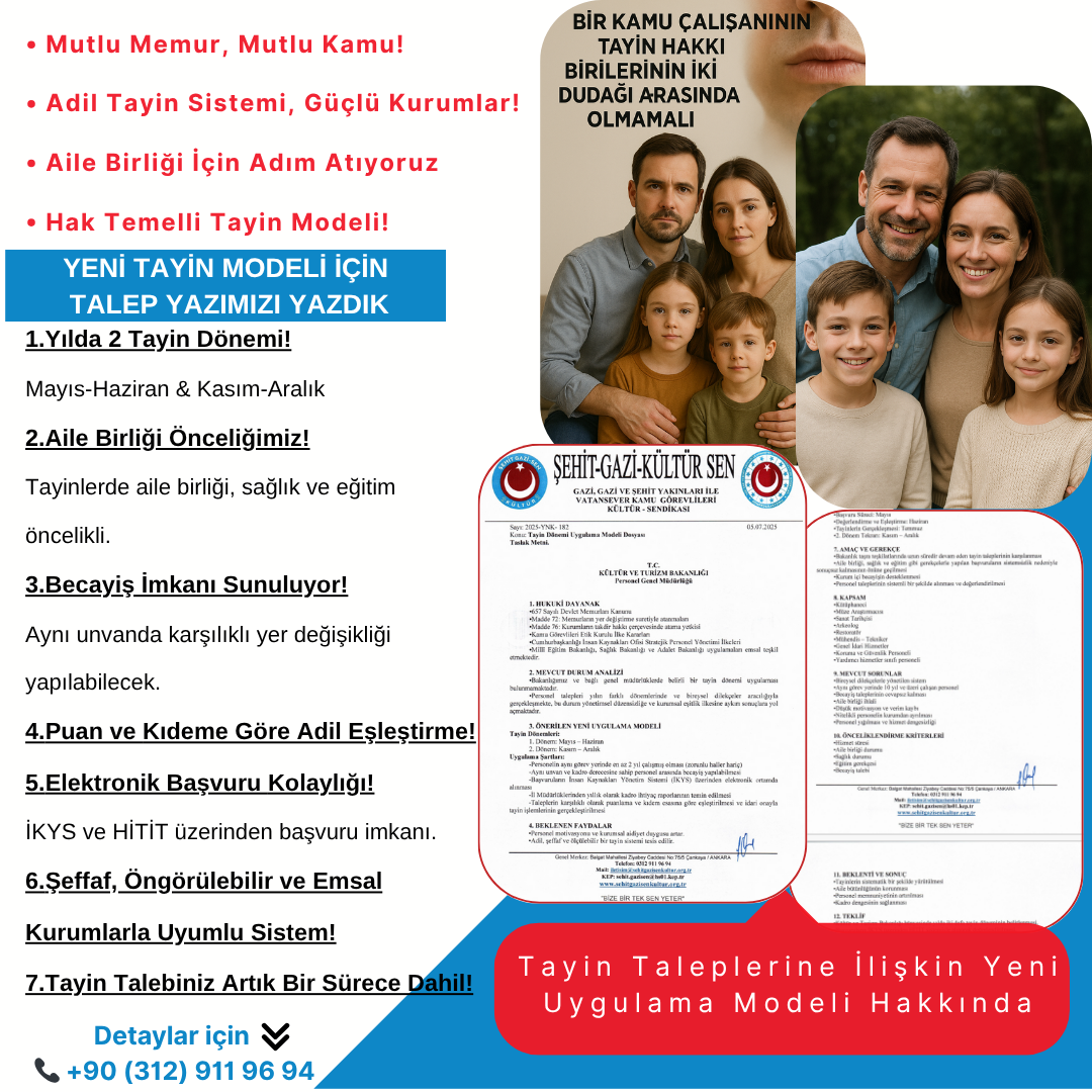 Özellikle aynı görev yerinde uzun süredir çalışan, tayin başvuruları yanıtsız kalan ve aile bütünlüğü bozulan üyelerimizin ve kamu çalışanlarının mağduriyetlerinin giderilmesi, sendikal sorumluluğumuzun bir gereğidir.