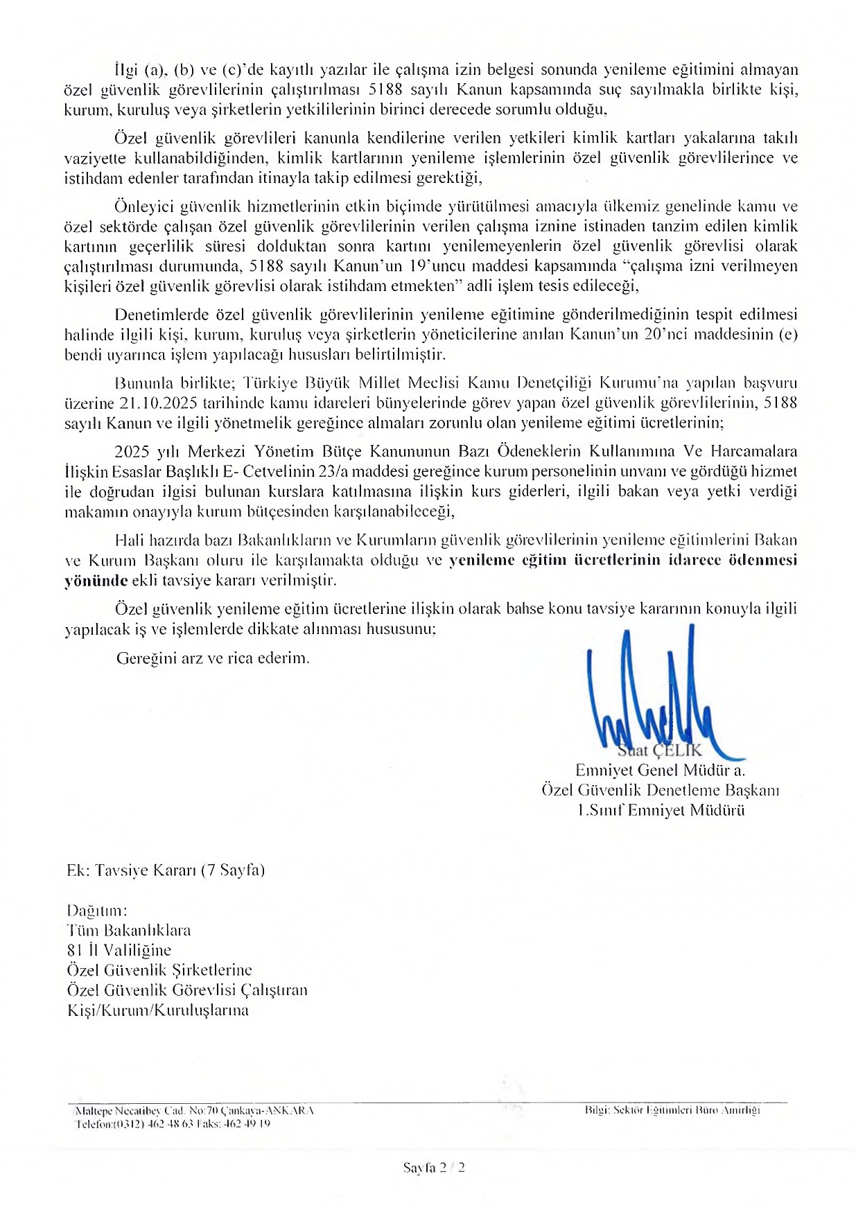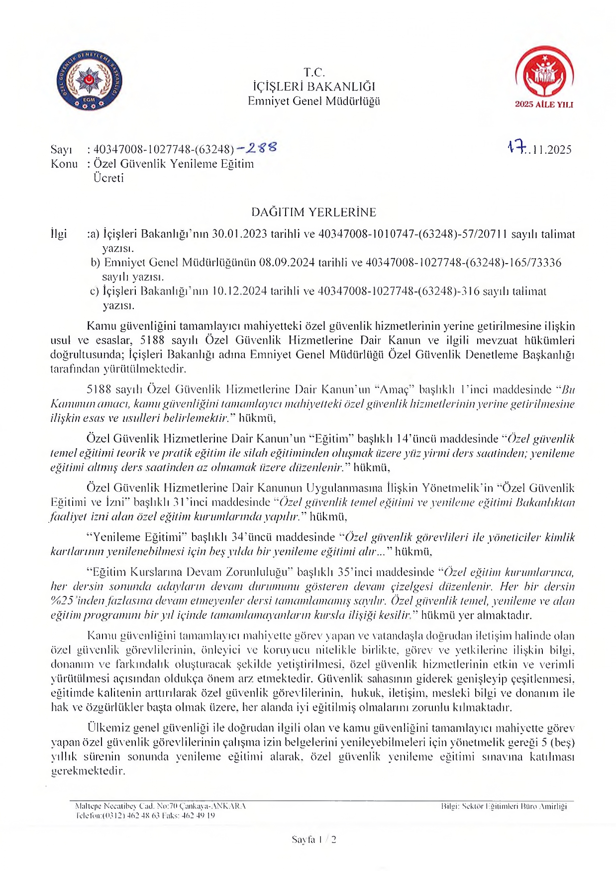 Emniyet Genel Müdürlüğü Özel Güvenlik Denetleme Başkanlığı tarafından yayımlanan yazı ile; kamu kurum ve kuruluşlarında görev yapan tüm özel güvenlik personelinin yenileme eğitimi ve kimlik yenileme sürecine ilişkin ücretlendirme, sorumluluk ve uygulama esasları açık bir şekilde belirlenmiş, sahadaki birçok tereddüt giderilmiştir.